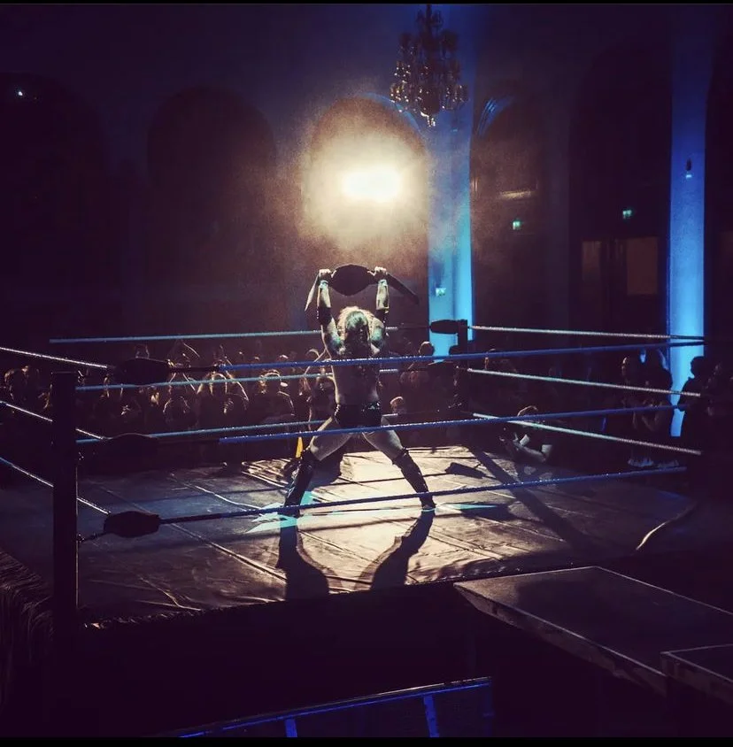 Shemeikka celebrates with the FCF Finnish Heavyweight Title belt after defeating King Kong Karhula in the main event of Talvisota XV. Photo courtesy of FCF wrestler Viktor Tykki’s Instagram account.