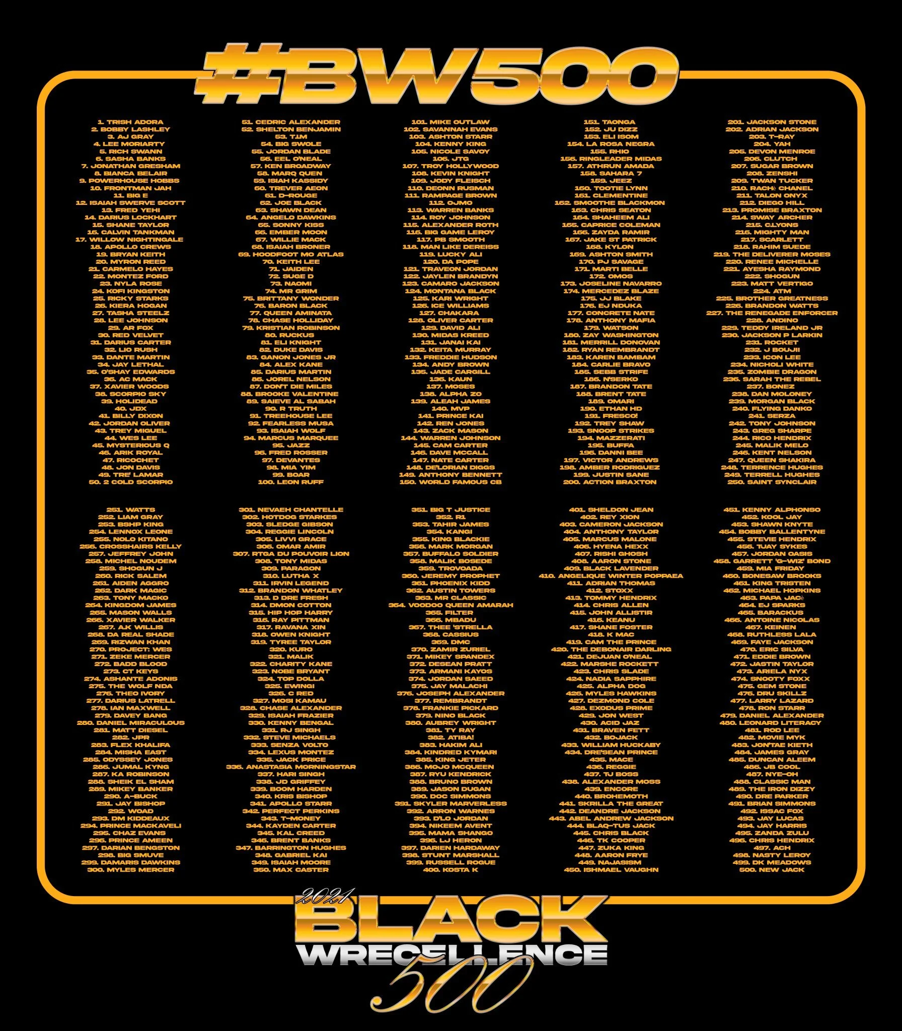 O # BW500 tornou-se um lançamento anual muito aguardado. A lista, que é criada e curada por Righteous Reg, que mantém o site BlackWrecellence.com e escreve para Pro Wrestling Illustrated, é uma homenagem ao PWI 500, a lista anual da Pro Wrestling Illustrated dos 500 melhores lutadores profissionais do mundo. O # BW500 se concentra nos 500 melhores lutadores profissionais negros do mundo, listando lutadores masculinos e femininos que estão competindo ao redor do mundo.