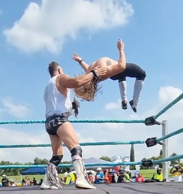 the crowd was hyped up for this as the high flyer came out strong against his much larger opponent...the see-saw battle was high energy despite the heat. Despite a valiant effort, Super Dragon wasn't able to overcome the immense size of his opponent.