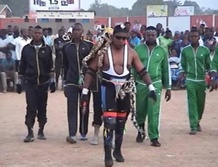 This win took place at the Provincial Championships in the Haut-Katanga province of the DRC. The match featured plenty of catch fetiche and voodoo wrestling tactics and the use of live animals and Jibick Mua Kajinga looked as intimidating as ever, brandishing his leopard skin on the way to the ring.
