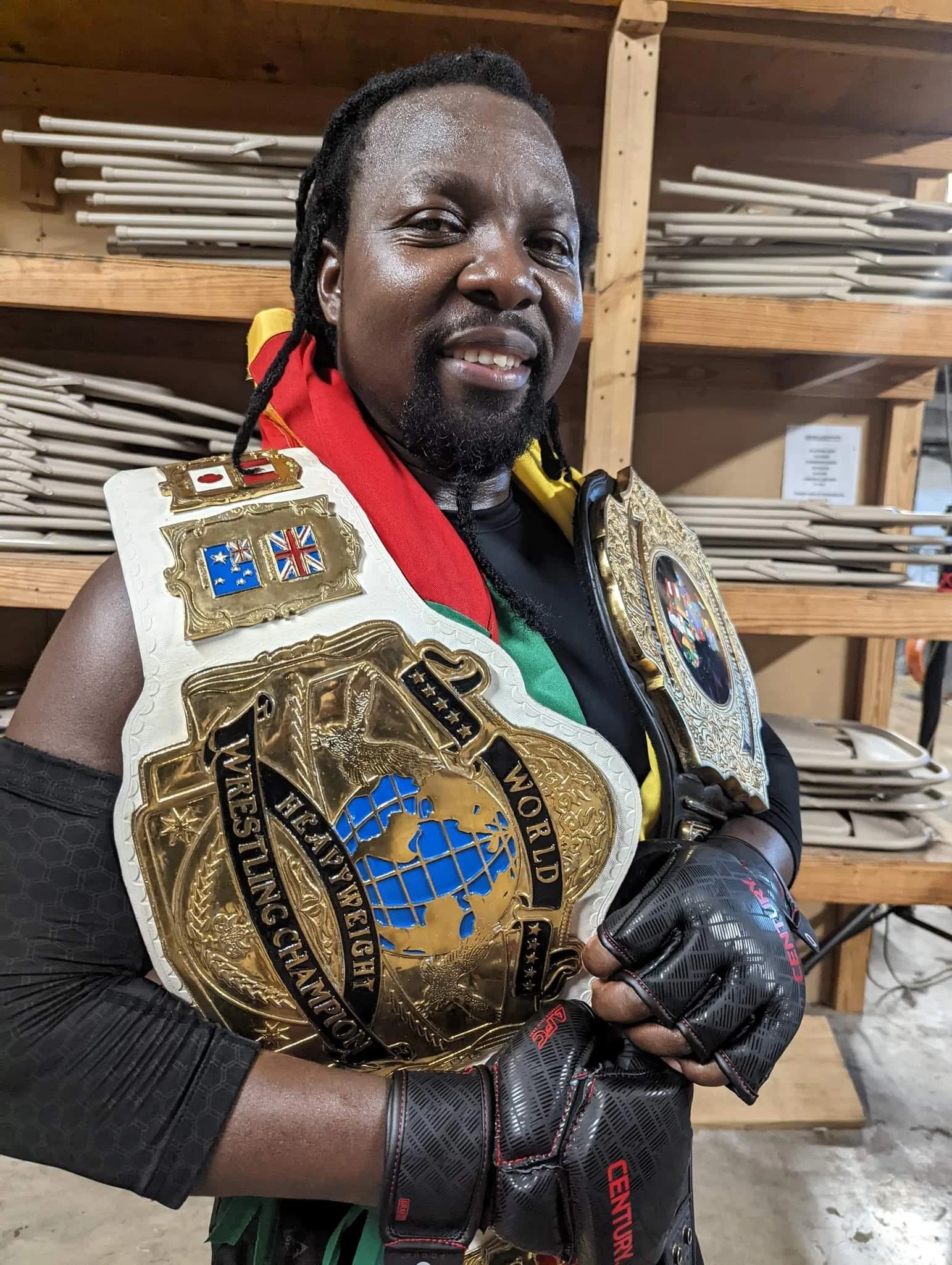 This championship title belt is a big milestone on The Wolf NDA’s journey in pro wrestling. Haling from Yaoundé, Cameroon, The Wolf had established himself as one of Africa’s absolute best pro wrestlers prior to making the journey to the United States. Among The Wolf’s accomplishments in Africa were challenging for the FECACATCH (based out of Cameroon) Championship belt in an outstanding ladder match against Kirikou (who would later become his tag team partner) and winning the Pro Wrestling Africa Middleweight Championship, meaning he represented the entire continent as Middleweight Champion. The Wolf is still reigning as the PWA Middleweight Champion and he has now added a second title to his collection, a world championship sanctioned by an American company.